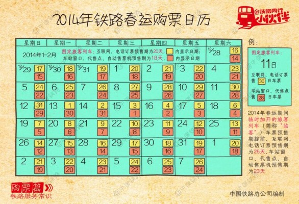 答:從總體上講,2014年鐵路春運火車票的預售期與日常火車票的預售期相同。其中,圖定旅客列車互聯網、電話訂票預售期為20天,即2013年12月28日發售2014年1月16日(春運第一天)車票;車站窗口、代售點、自動售票機預售期為18天,即2013年12月30日發售2014年1月16日車票。